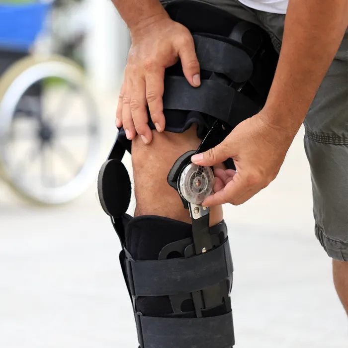 specjalistyczne ortezy po operacjach (np. buty marszowe po korekcji haluksów, ortezy kolanowe z regulacją kąta zgięcia);